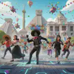 A vibrant celebration of Mexican Independence Day, featuring a crowd waving Mexican flags, fireworks in the night sky, and traditional papel picado banners, festive and colorful.